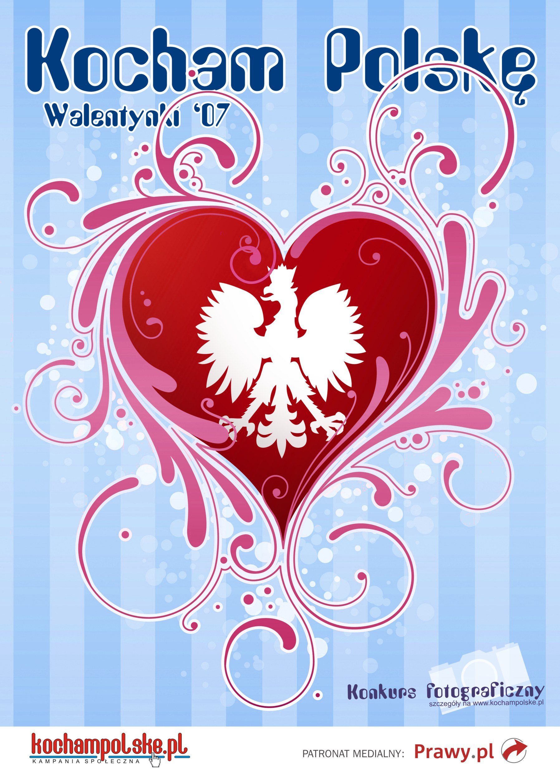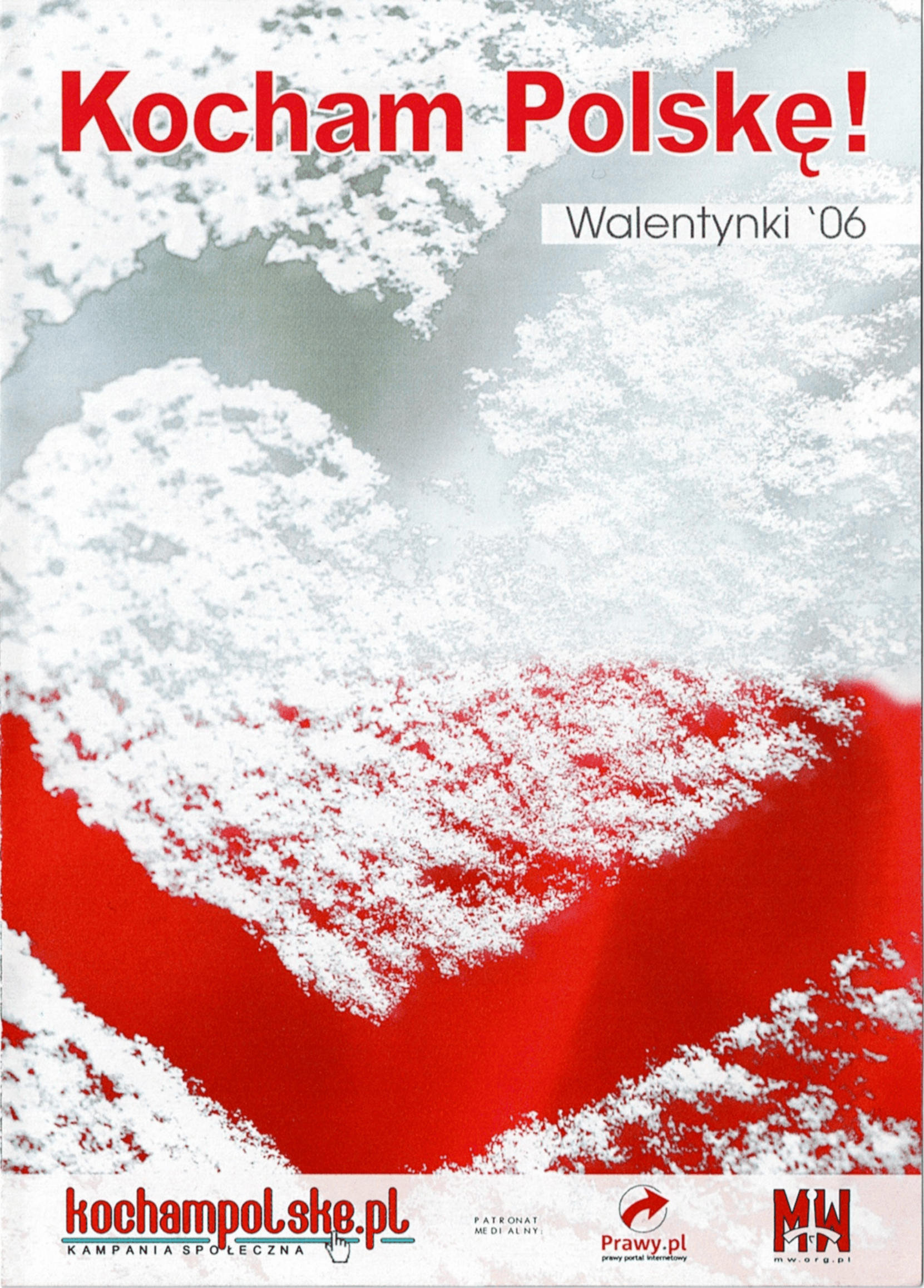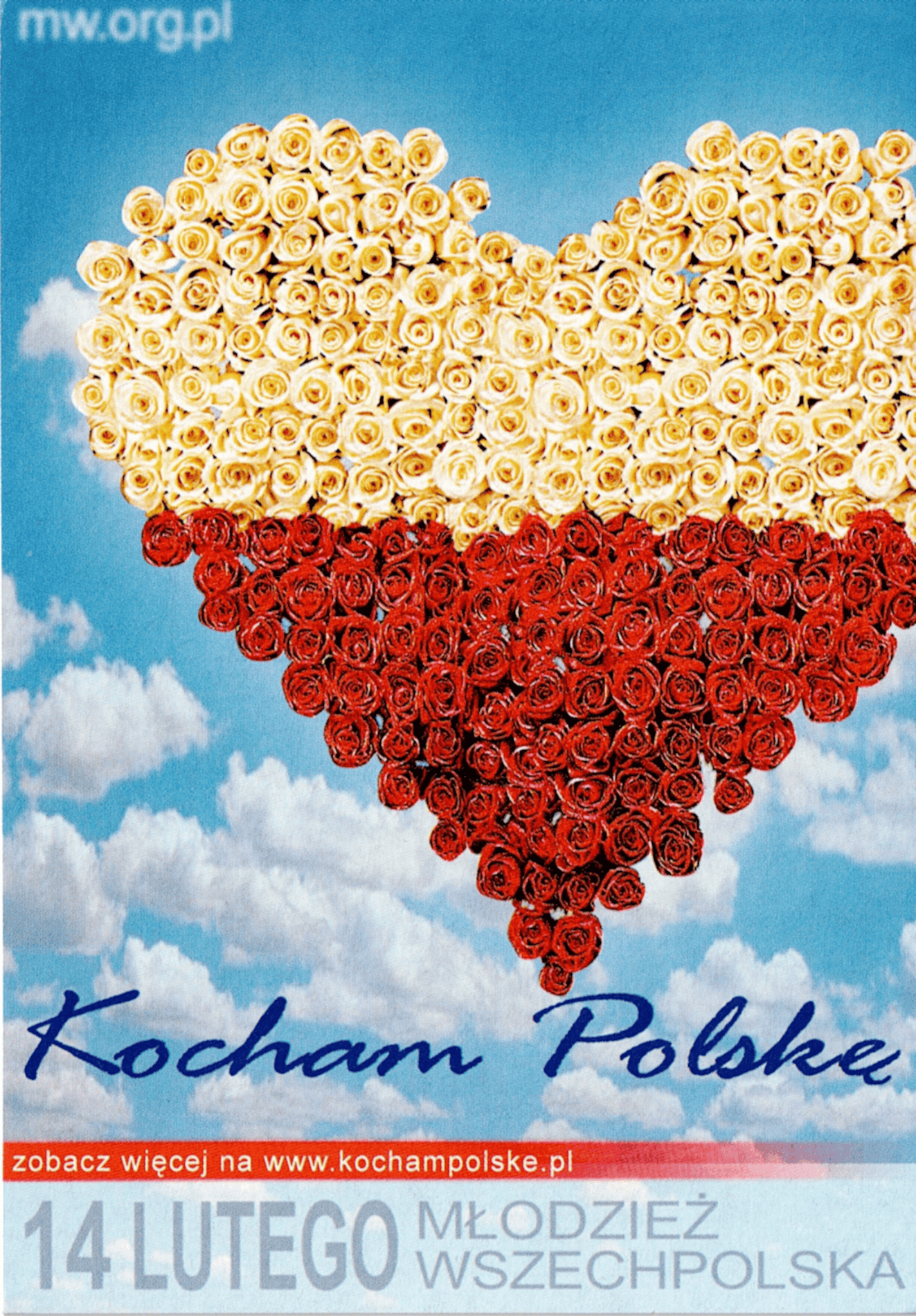 Plakat „Kocham Polskę” z 2007 roku ma lekki, walentynkowy charakter, ale przekaz jest jednoznaczny: miłość do Ojczyzny można okazywać wprost i bez kompleksów. Centralnym motywem jest serce, a w jego wnętrzu biały orzeł - proste połączenie emocji z tożsamością narodową.